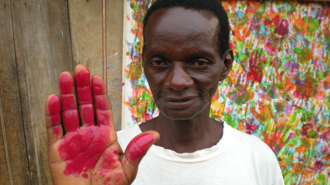 This vibrant piece was created during a one-week journey in 2010, reaching nine villages and surrounding regions where community members came together to share their hand impressions and stories.